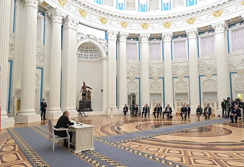 Es de destacar que unas horas antes del discurso del Presidente de Rusia, el Kremlin anunció que el presidente ruso había decidido firmar un decreto de reconocimiento de las Repúblicas Populares de Lugansk y Donetsk, lo cual fue anunciado durante una conversación telefónica con el presidente francés y el canciller alemán.